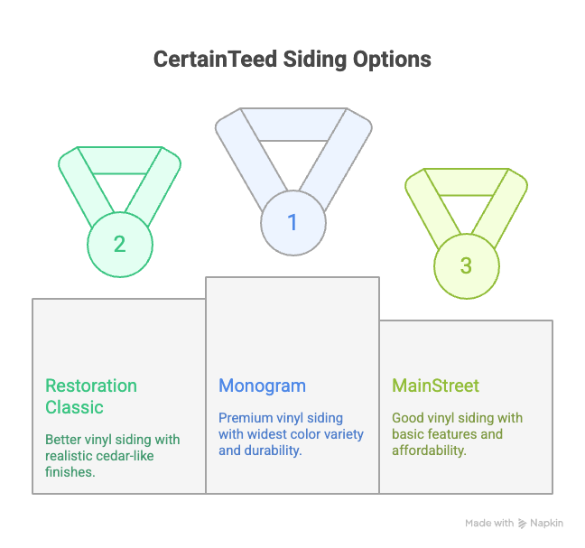 CertainTeed offers one of the widest ranges of vinyl colors, textures, and finishes. You can even get options that mimic wood grain. If you’re trying to balance affordability with curb appeal, vinyl can deliver variety without breaking the bank.