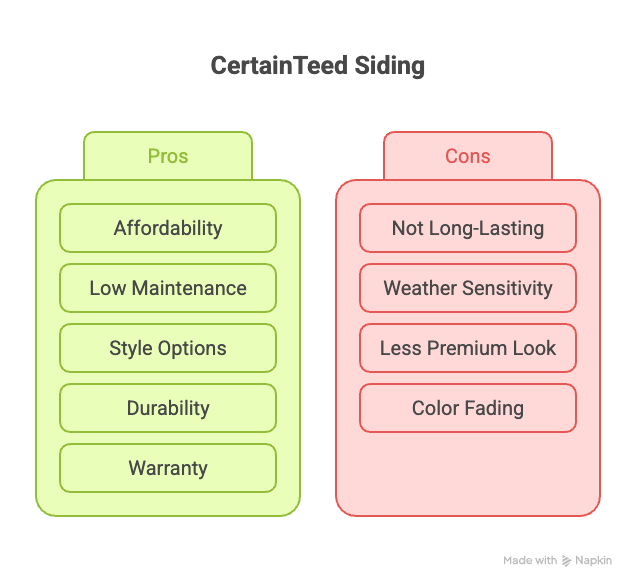Vinyl siding—including CertainTeed—typically lasts around 20–25 years. While that lifespan is respectable, it’s shorter compared to alternatives like metal siding (40+ years) or fiber cement siding (30–50 years). If you plan to stay in your home long-term and want to avoid another replacement project down the road, CertainTeed may not provide the maximum return on investment.