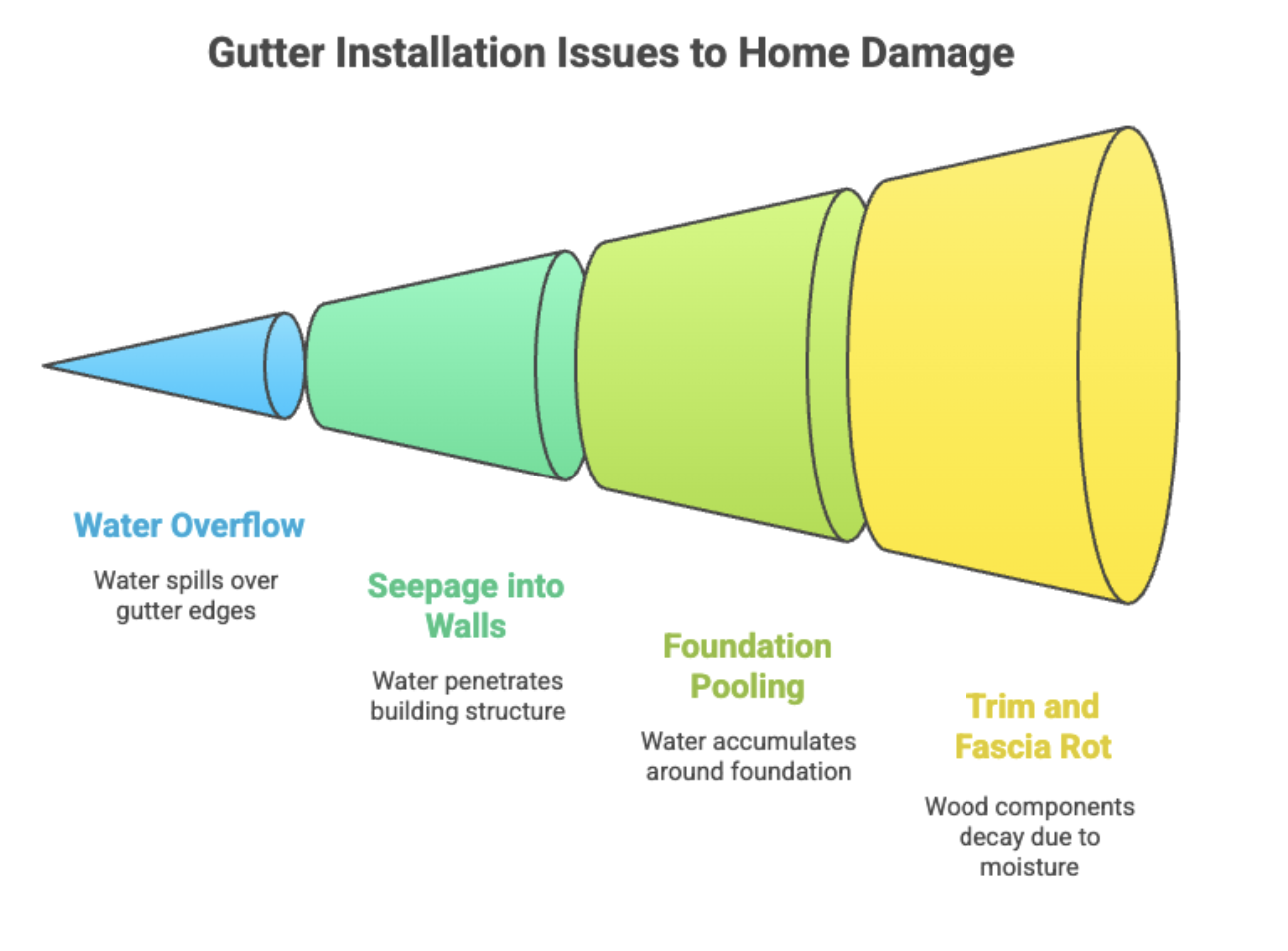 When gutters are installed incorrectly, water doesn’t flow where it should. Instead, it overflows, seeps into walls, pools around your foundation, or rots away trim and fascia boards. What starts as a “small drip” can snowball into foundation cracks, roof leaks, basement flooding, and thousands in repairs.